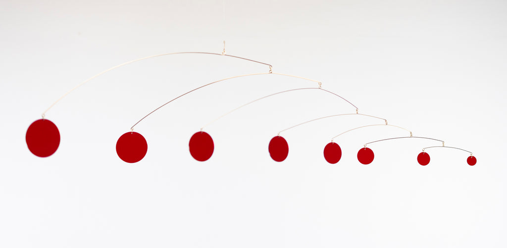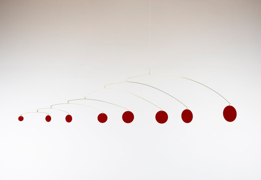 A kinetic mobile of eight acrylic discs arranged in ascending order of size, but balanced to be on the same level.